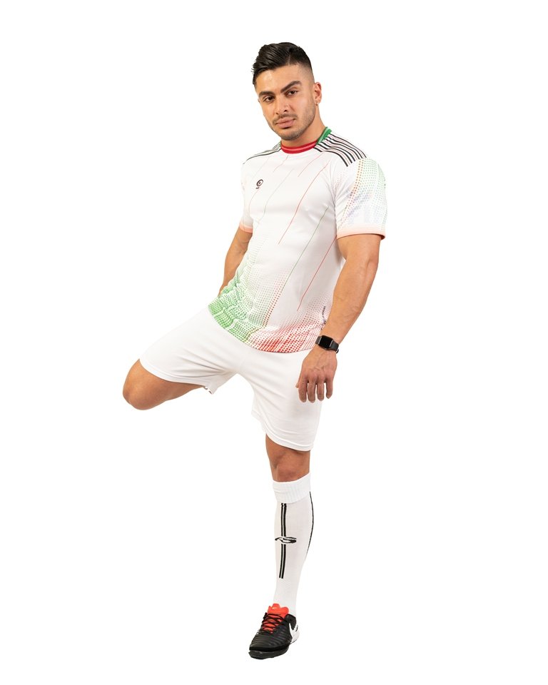 پیراهن و شورت فوتبال مدل ایران یک لباس زیبا و خاص مناسب تمرینات و مسابقات فوتبال است. این پیرهن شورت با متریالی عالی و تن خوری عالی توسط گروه تولیدی هدف اسپرت طراحی و تولید می شود. جنس ست فوتبال پیشنهادی امروز از فیلامنت عالی می باشد که در هنگام فعالیت باعث می شود ورزشکار احساس راحتی داشته باشد. این لباس ورزشی در طیف زیبایی از رنگ سفید و الگو برداری از لباس تیم ملی ایران، طراحی و در سایزهای لارج تا دو ایکس لارج موجود است.